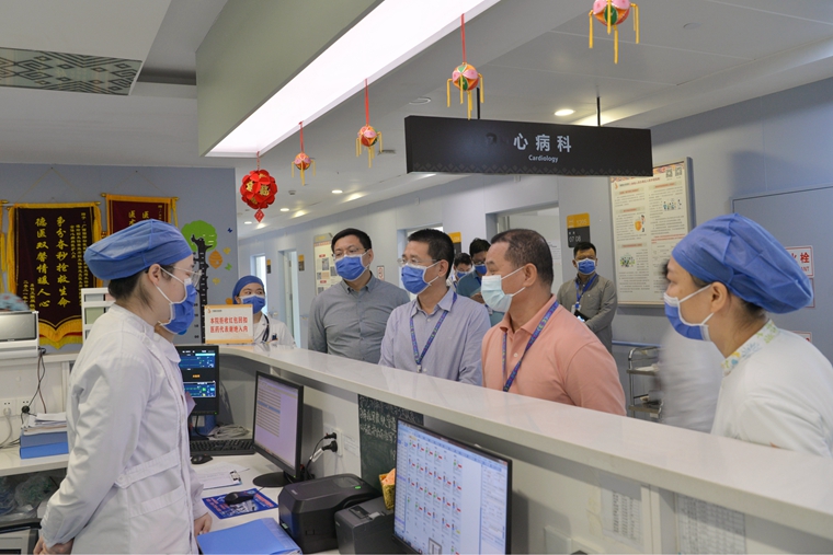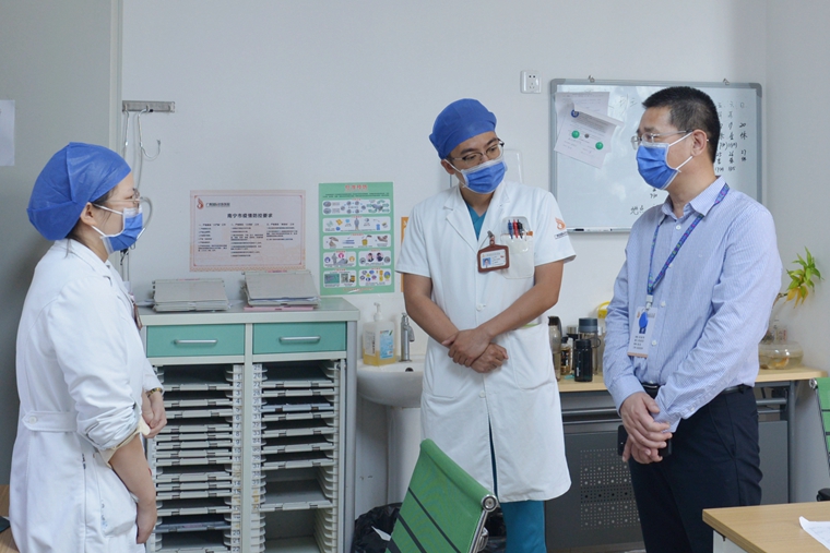 岳桂华一行先后来到医院各预检分诊台、体温监测岗、急诊24小时核酸检测点及住院部病区等地,认真查看测温扫码通行等措施执行是否到位,通过检查台账、抽查问题、面对面交流等方式对疫情防控工作进行督查,考察工作人员对工作流程的掌握情况及应急处理能力,并叮嘱他们做好个人防护工作。岳桂华一行还进行了现场办公,进一步梳理优化疫情防控流程。