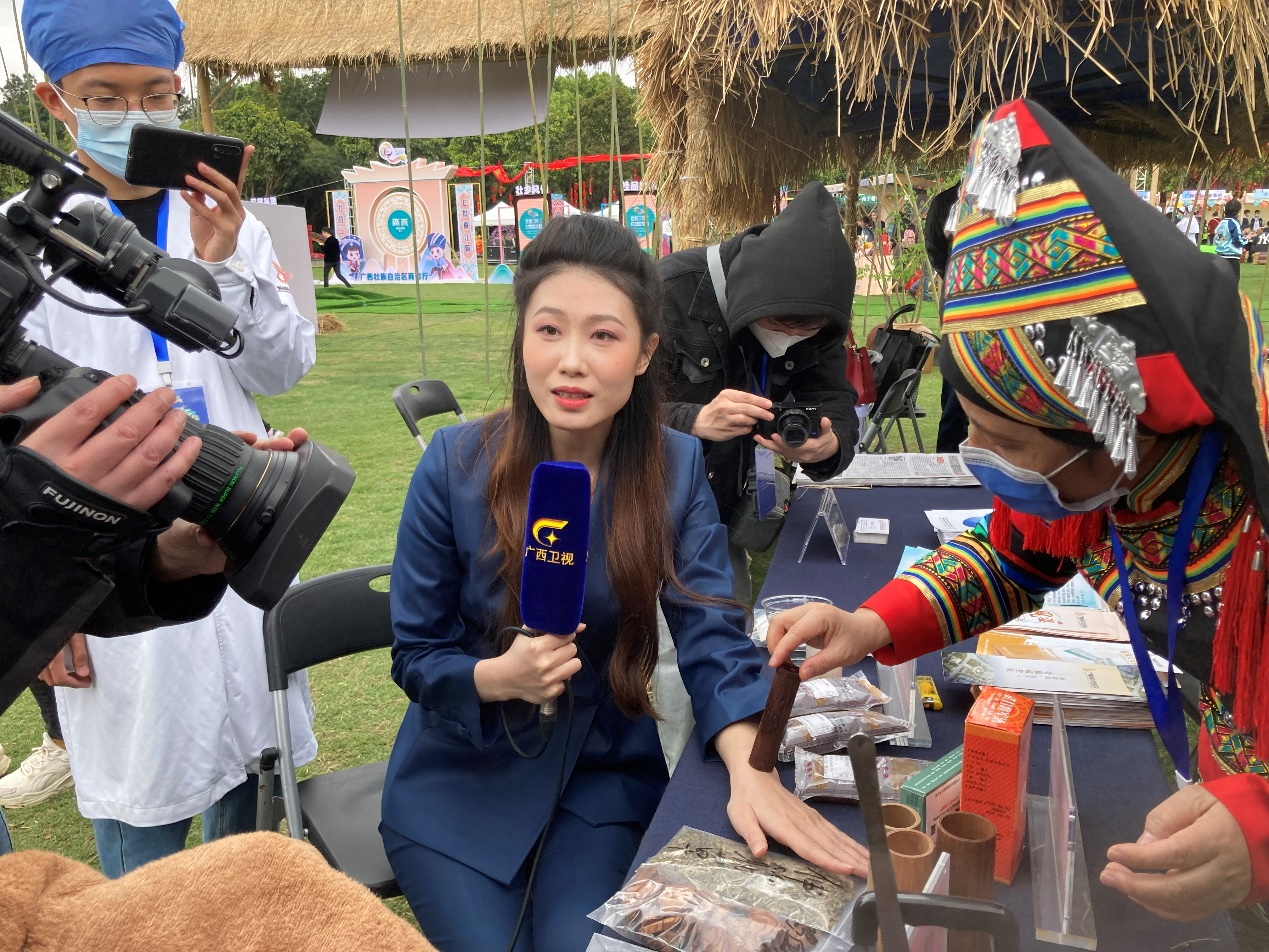 青秀山桃李芳华,壮瑶药香飘四溢,正在现场录制“壮族三月三·八桂嘉年华”大直播的广西卫视主持人也闻“香”而来,通过摄像机镜头,向全国电视机前的观众讲述拔竹罐的亲身体验。