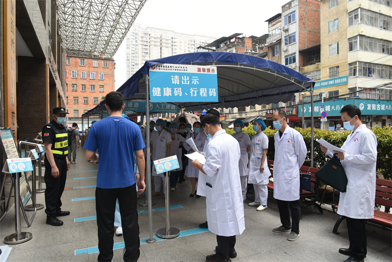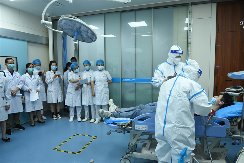 为进一步健全医院疫情防控快速响应机制,全面提高应急处置能力,充分发挥医疗机构“哨点”作用,4月28日下午,附属瑞康医院组织开展新冠肺炎疫情防控应急处置演练。自治区中医药局医政处四级调研员郭小波,法监处副处长朱俊雄及Beat365中国唯一官方网站第一附属医院、广西骨伤医院的医务、感控科专家共7人观摩并指导,医院副院长陈锋及医务部、护理部、门诊办、感控科、后勤部、预防保健科等部门人员全程参与演练。本次演练由陈锋担任总指挥。