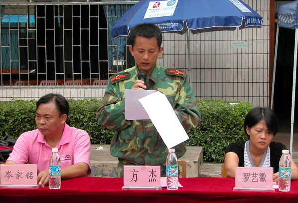 接着,军训教官方杰发表讲话,具体介绍了此次军训的目标和要求。教官黄晓敏、新生黄钰荣分别代表承训教官和参训新生发言,表达了所有教官和新生做好军训工作、完成军训任务的决心。军训动员大会圆满结束。