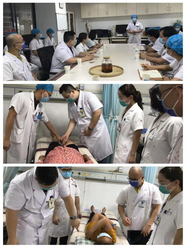 黄锦军名老中医工作室团队及蔡凯主任医师、冯福明副主任医师还深入到相关科室,为在院疑难患者进行病例讨论及教学查房。通过教学查房,规范了教学查房的流程,使医护人员对疾病的临床诊疗思维更清晰,操作流程更简化,推拿技艺更娴熟。