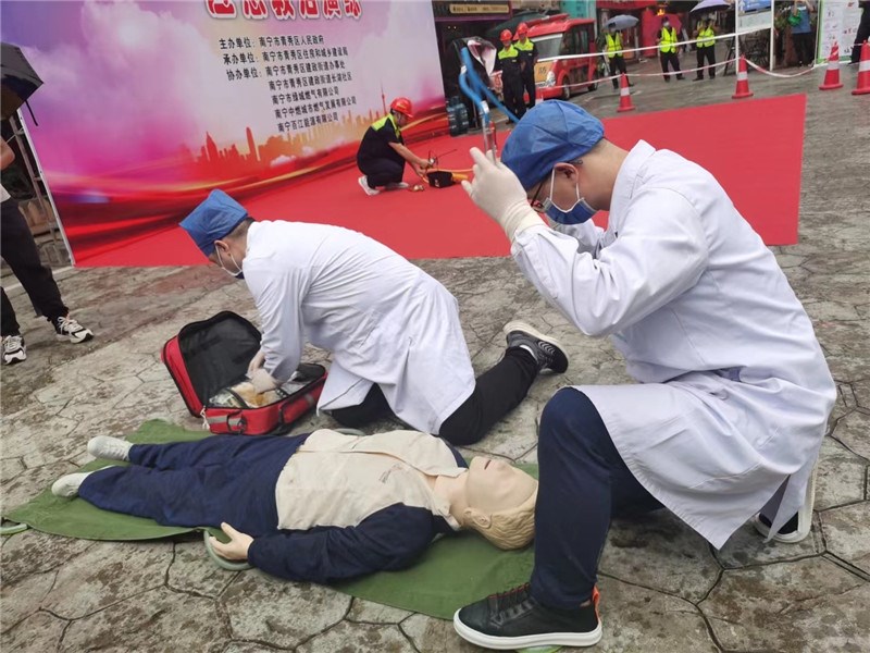 “618”消费者购物节来临之际,一附院受青秀区人民政府的邀请,于6月16日上午,由外联拓展部组织东葛院区急诊科,按要求为附近商户与居民现场进行急救演练展示。