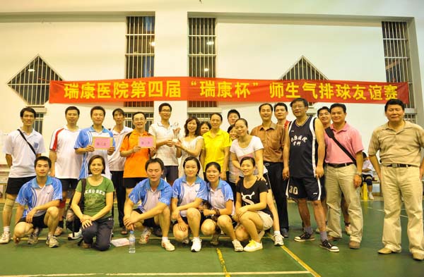 为同庆教师节、中秋节、国庆节、迎亚运,增进瑞康临床医学院教职工之间及教职工与学生之间的交流,瑞康临床医学院教务学生党总支及瑞康临床医学院工会共同组织开展了第四届“瑞康杯”气排球赛。经过3天3轮28场的激烈的循环赛、淘汰赛,在2010年9月20日晚圆满结束,医院党政代表队、骨伤学教研室代表队、药学代表队、内科学教研室代表队分别荣获冠军、亚军、季军、第四名,瑞康临床医学院党委陈日兰副书记亲临比赛现场,并为获奖选手颁奖。本次比赛受到了广大教职员工的普遍欢迎,通过这次比赛,使各个参赛队之间切磋了球技,增进了师生间的友谊,更是增强了医院的凝聚力和大家的集体荣誉感。