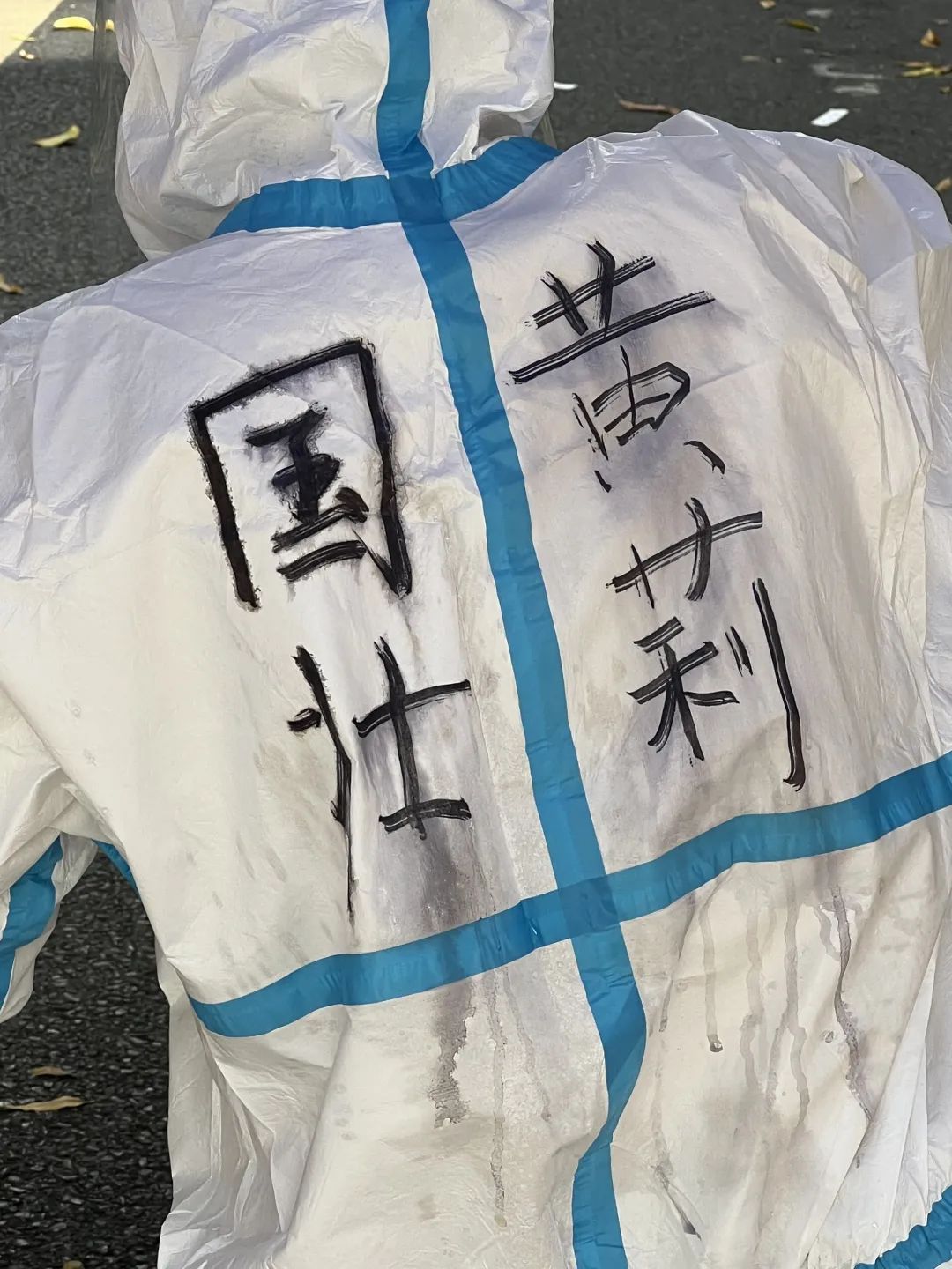 这是一套“热到变形”的防护服。汗水浸透了内穿衣,打湿了防护服,后背上用马克笔写上的名字被“蒸”“化”了。