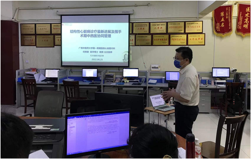 为推动基层中医药服务能力提升,发挥中医药独特作用,传播名中医学术思想和技术专长,8月24-25日,一附院李伟伟名中医学术传承团队协同心血管内科二区何贵新主任等一行人到田东县中医医院开展2022年“名中医八桂行”活动,进行了学术交流、教学查房、病例讨论等活动。