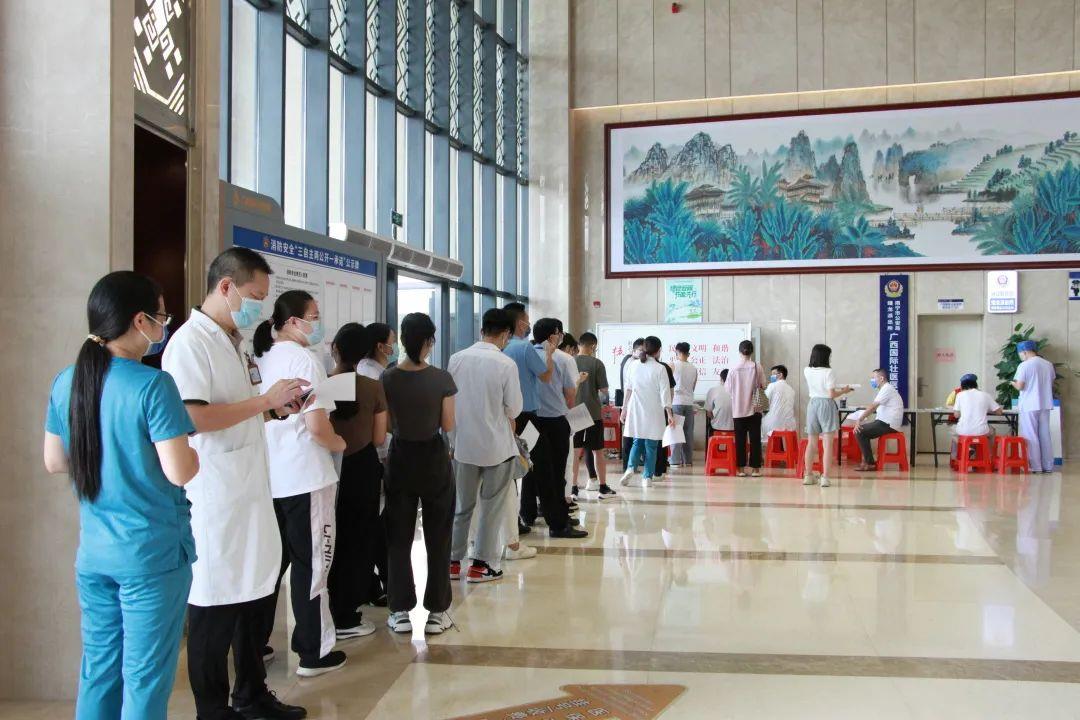 8月25日上午,“抗击疫情,为爱逆行”无偿献血活动在附属国际壮医医院门诊一楼举行。医院干部职工踊跃参与。