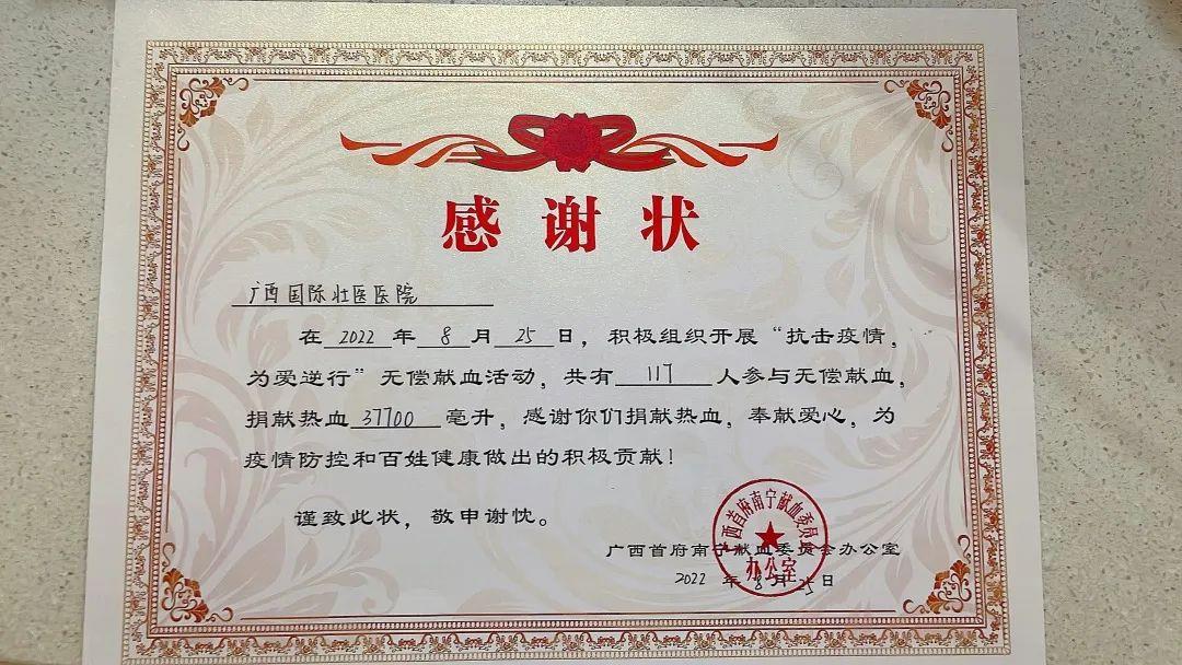 据统计,当日附属国际壮医医院共有117名干部职工参与了无偿献血,献血量共计37700ml,为疫情防控和百姓健康做出了积极贡献。