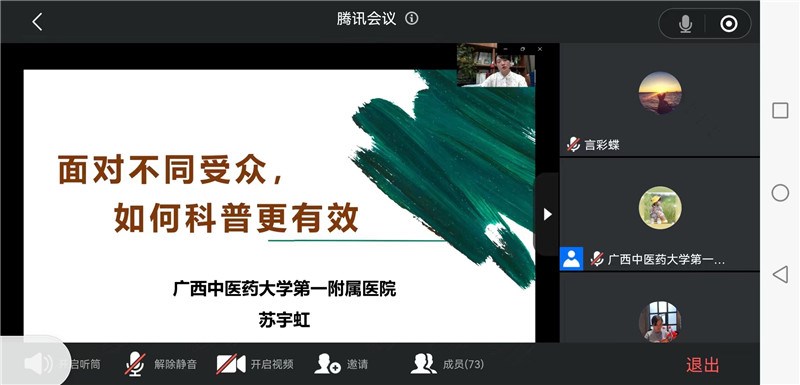 科普作为一种群众性的普及教育活动,它的群体涉及的面很广,护理部副主任苏宇虹以“面对不同受众,如何“科普”更有效”为题,讲授面对学生、工人、农民、军警、公务员等不同职业群体的特性、兴趣、需求,结合一附院近年来开展的科普工作实际情况,介绍科普工作实施策略。内分泌科护士长陆小娇讲解了健康背景下糖尿病护理的科普实践与思考,从源行动、在行动、专科取得的科普成果等方面分享了科普心得。