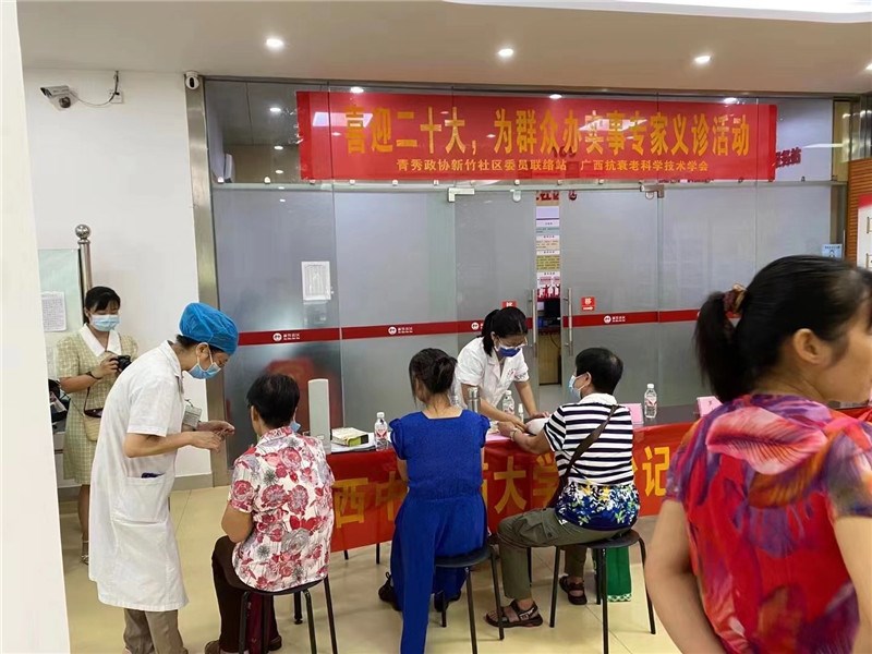 应青秀区政协新竹社区委员联络站的邀请,以关爱老年人的身心健康为主题,联合广西矿衰老学会对新竹社区居民开展健康义诊活动。9月30日上午,一附院组织仁爱分院针灸科、东葛院区内分泌科、心胸外科医务人员前往新竹社区开展义诊活动。