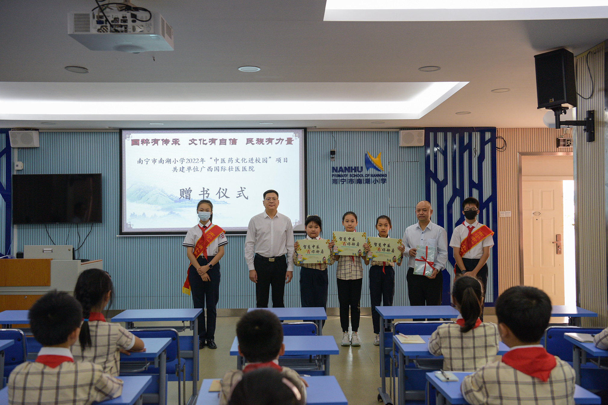 10月31日下午,附属国际壮医医院副院长、总会计师唐盛军率医院中、壮、瑶医专家参加南湖小学“中医药文化进校园”项目——“初爻”社团学期项目式综合性实践活动成果展,并向南湖小学赠送了中医药科普读物、涂色绘本。