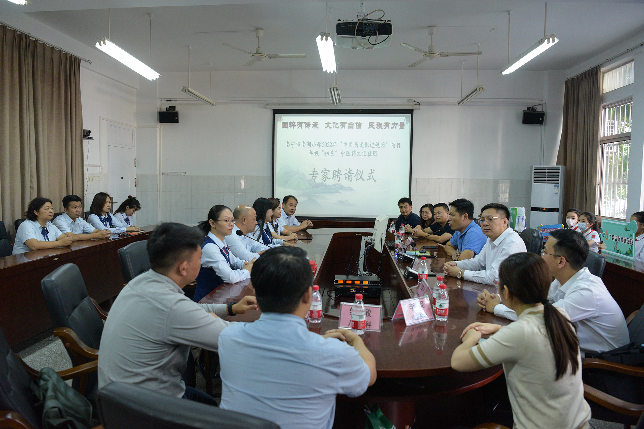 为确保“中医药文化进校园”活动顺利开展,我院选派了6名中、壮、瑶医专家对学校各年级进行专业的指导和技术支持。校方举行专家聘请仪式,学校党委副书记梁东毅为我院6名专家授聘书。