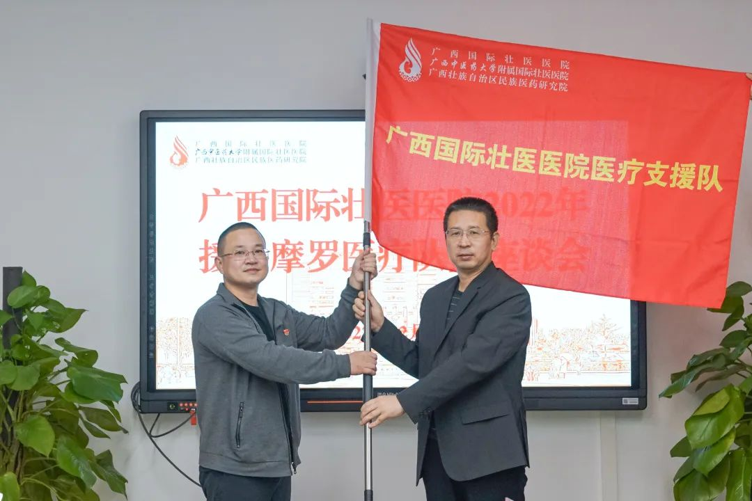 岳桂华向谢进授“广西国际壮医医院医疗支援队”旗帜