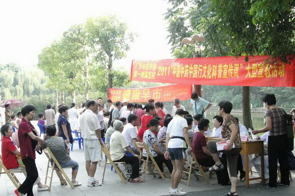 义诊伊始,排队等候的群众及病友就有50多人,专家们一边给病友义诊,一边答疑病友的提问,开具中药处方100余份。有的还针对不同对象进行中医药治未病健康教育。由东葛社区卫生服务中心健康宣教专职员进行的健康教育别开生面,她们用贴近生活的语言对中医基础理论、中医脏器及其功能进行通俗易懂的介绍和说明,并就中医养生保健基本方法和中医健康养生操作现场演示和指导。中医健康养生操吸引了病友们极大的兴趣,现场跟从练习的病友就达20多人,形成一道独特的风景线。义诊现场还发放了《中医养生保健手册》、《广西首府百名中医民族医专家手册》、《广西首府中医民族医特色专科手册》各100册,中医防病宣传材料300余份。