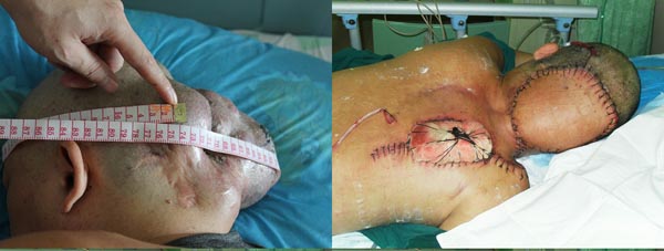14日早上8时,由神经外科科主任范学政博士主刀,在张鉴文副主任医师、黄进能副主任医师、洪翰林医师等专家的协助下,按照手术设计方案,切除患者巨大肿瘤,切除肿物近5斤。紧接着,耳鼻喉科刘继远主任采取从背部保留皮蒂翻转植皮、腹部取皮植到切除部位等方式,对李先生手术部位进行修补,于下午7时完成了这台高难度的手术,李先生的脑肿瘤终于得以顺利切除。