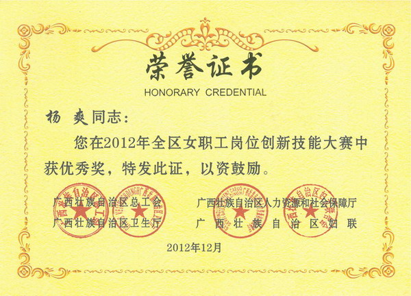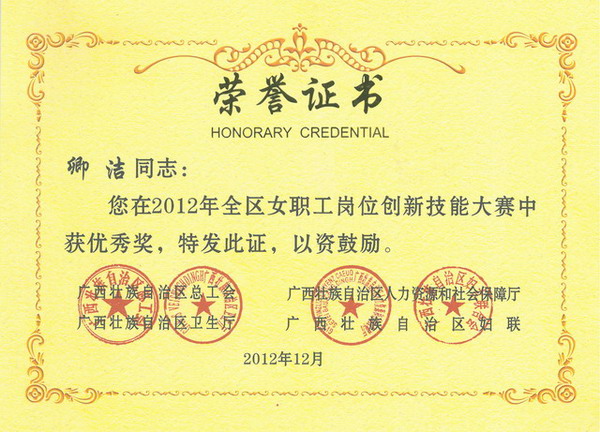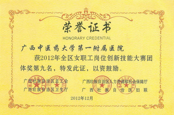 一附院荣获2012年全区女职工岗位创新技能大赛团体优胜奖