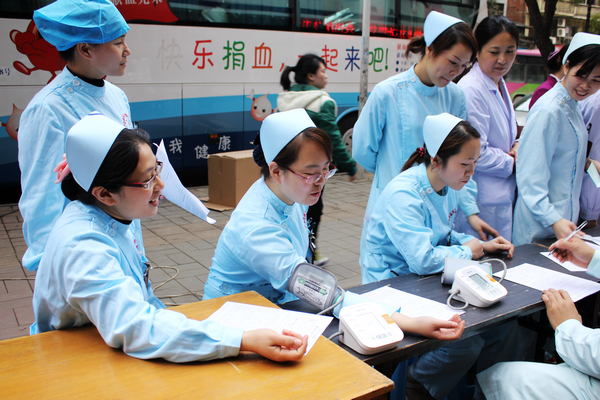 瑞康医院心胸外几名护士正在量血压为献血做准备