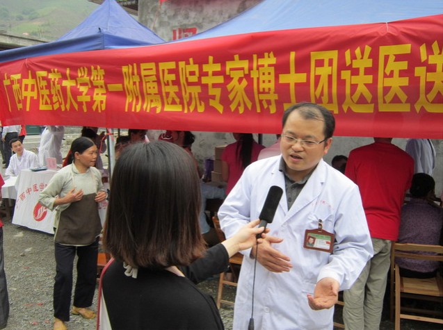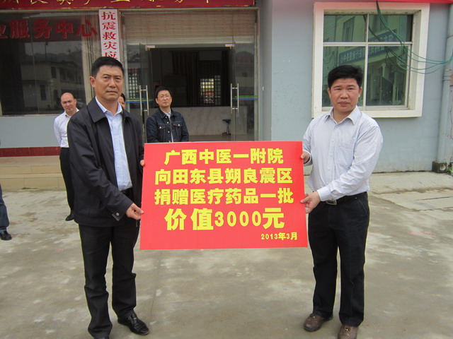 2013年3月14日,一附院“广中医专家博士巡回义诊团”系列活动第一站来到田东地震灾区一线,为受灾群众送医送药。此次义诊团活动由医院副院长周建国带队,率领医院各科专家、博士、医学生一行19人,到田东县朔良镇六羊村六里屯异地搬迁安置点为地震受灾群众送医送药。