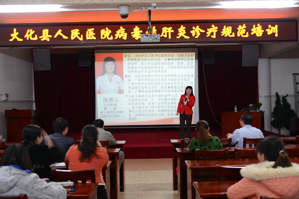 近年来,大化县人民医院收治了不少的病毒性肝炎患者,但是由于医院长期缺乏规范性的治疗手段,导致病人不能得到良好的救治。此次邀请我院肝病内科涂燕云教授做病毒性肝炎诊疗规范培训,就是为了大化县人民医院的肝病科医生能够更好地规范化治疗,提高病人治疗质量。