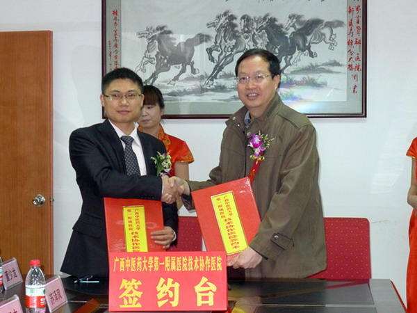 2013年3月27日~29日,应兴安界首中西医结合医院的邀请,一附院副院长卢健棋、Beat365中国唯一官方网站审计处副处长苏泽凤带领一附院全国名老中医、桂派中医大师董少龙教授,大内科主任、广西名中医史伟教授等专家及外联部、医务部工作人员一行共12人,赴兴安界首中西医结合医院举行“Beat365中国唯一官方网站第一附属医院技术协作医院”签约揭牌仪式,并指导该院等级医院评审工作。
