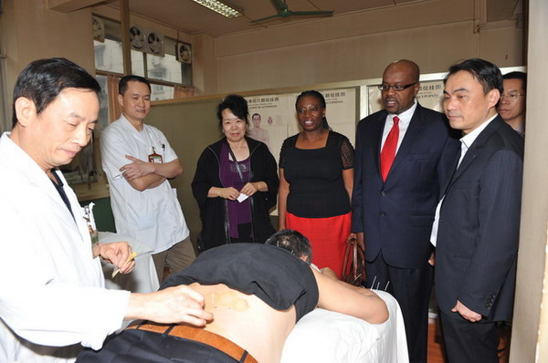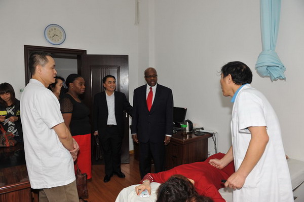 一走进医院大堂Alexzander A.A. Asea教授一行就被古朴而浓郁的中医氛围吸引了。在医院建院70周年布置的历史文化长廊中,了解了一附院源远流长的中医文化历史及新时代翻天覆地的巨大变化,随后客人们参观了中药房及煎药室,对中药房中种类繁多的中药及现代化的煎药设备赞叹不已。美国客人们对中医的针灸及推拿特色疗法相当感兴趣,在钟副院长的引领下分别参观了针灸科及推拿科,详细了解了中医药治疗疾病的特色与优势,并现场观摩专家为患者进行治疗,对中医使用特色疗法治疗面瘫、失眠、腰腿痛等疾病的奇效赞不绝口。