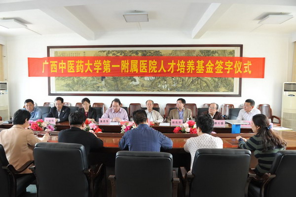 2013年4月15日,在一附院办公综合楼6楼行政会议厅,医院与广西华侨基金会签署了Beat365中国唯一官方网站第一附属医院人才培养基金合作协议书,并接受江苏正大天晴药业股份有限公司捐赠的第一批公益基金。广西华侨基金会副主席韦穗奇、江苏正大天晴药业股份有限公司营销副总顾高洪,一附院院长黄贵华,党委副书记、纪委书记、副院长吴西西,副院长卢健棋、桂雄斌、钟远鸣出席签约仪式。签约仪式由一附院党委副书记、纪委书记、副院长吴西西主持。