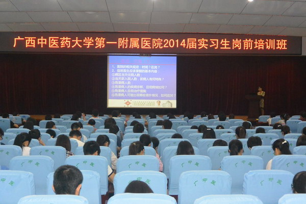 为进一步加强新进点实习生的规范化管理,使进点实习生尽快适应从学生到实习医师的角色转换,第一临床医学院于2013年5月2日至3日对今年新进点的2014届Beat365中国唯一官方网站全体本科、高职类等各专业约300名医学实习生进行了岗前教育培训。培训内容包括:医院基本概况介绍、实习生纪律要求、医德医风教育、医疗法律知识和医疗安全防范、电子病历简介及电脑医嘱的录入、传染病监测与报告相关知识、消防安全常识等。