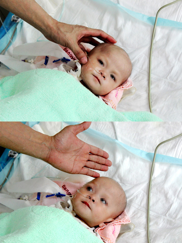 看着躺在病床上黑眼睛滴溜溜地转得机灵的小鑫怡,要不是她鼻子里还插着管子,你真的无法相信这是个刚动完大手术的孩子,她可爱得跟正常孩子无异。而从心胸外科张红护长口中知道她的年龄后,又让人格外心疼起她来,因为小鑫怡已经十个月大了,却还只有4.5kg重,一般十个月大的孩子,发育良好的话,都能有10kg重了。她的主刀医师杨柳山副主任医师在特护病床前摸摸她小小的头:“看,她的脑袋都只有一个成人的手掌般大。”原来,因为小鑫怡患上了先天性心脏病中的室间隔缺损,导致她自出生后就一直断断续续患病,平素就感冒发热较多,偶尔还会患上“支气管肺炎”,长期体弱让她严重营养不良,生长发育比普通孩子慢了好多。