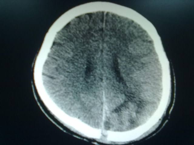 患者于2年前开始出现左眼眶周疼痛,之后左眼视力逐渐下降,曾在柳州、南宁等多家医院就诊,症状无明显好转。入院4个小时前在睡眠中突然出现剧烈头痛,伴有四肢麻木痉挛,呕吐胃容物一次,之后症状迅速加重,遂到我院急诊科就诊。患者入院2个多小时出现烦躁、神志不清、昏迷,左侧瞳孔散大。面对病情突发恶化,该科副主任,当班的二线医师张高炼主任医师紧急会诊并组织科室人员进行讨论,经过详细专科检查,并参阅影像资料,患者病情考虑为“脑肿瘤卒中并脑疝形成”。鉴于患者恶性脑肿瘤合并急危重并发症,生命垂危,必须尽快开颅手术抢救。