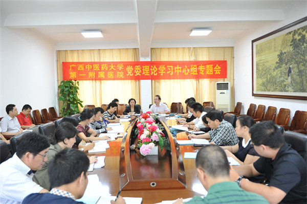 2013年9月26日下午,一附院党委理论学习中心组在医院行政楼6楼会议室召开专题学习会,学习贯彻中央、自治区及学校党委关于开展党的群众路线教育实践活动的有关文件和讲话精神。研讨如何结合一附院和科室的实际,提高医疗服务水平,为群众提供更优质的医疗服务。一附院党委书记李敏智,院长黄贵华,党委副书记、纪委书记、副院长吴西西,副院长周建国、钟远鸣,以及一附院党办、院办、宣策办、人力资源部、工会、医务部、护理部、科研部、教学部、财务部、后勤部、门诊部、药学部、仁爱分院、元之源公司等负责人及部分党总支书记参加了本次学习会。会议由李敏智书记主持。