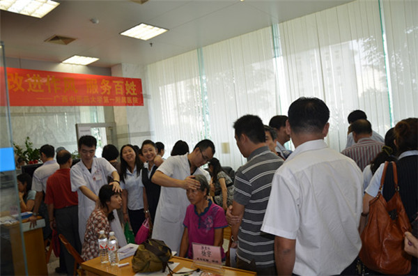 2013年10月11日上午,一附院组织内分泌科、脾胃病科、康复科、美肤激光整形科、治未病中心的广西名中医、博士后、教授等七位专家,来到中国建设银行区分行社区进行义诊,义诊活动受到建行社区居民的热烈欢迎。中国建设银行广西区分行纪委书记杨静挺、行长助理张石强、工会办公室王祖培主任等领导来到义诊现场,并体验了中医药特色诊疗项目。
