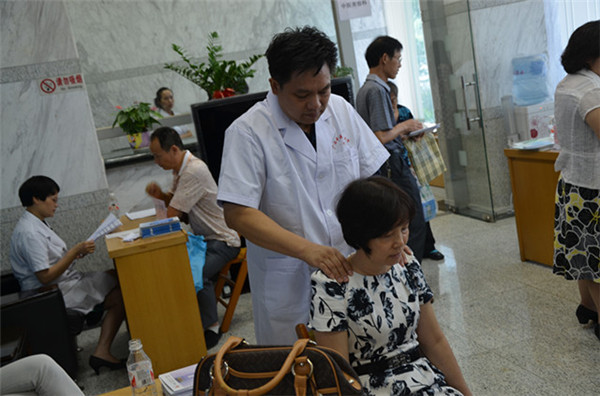 广西名中医、教授周宾宾主任正在给居民做康复保健治疗手法