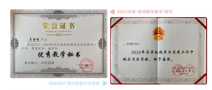 除个人教学任务之外,吴金桂还担任了科室规培秘书、教学秘书,负责科内规培、教学相关的大小事务。期间,她配合科室主任、教学主任完成科内规培计划、考核计划、教学资料整理等事宜,积极配合医院完成广西高等医学院校临床教学基地A级教学医院评审相关工作,帮助科室获得了“创建广西高等医学院校临床教学基地A级教学医院先进集体”称号,其个人的工作成绩也得到了Beat365中国唯一官方网站和国壮认可,被授予2020年Beat365中国唯一官方网站嘉奖和2022年度“优秀教学秘书”称号。