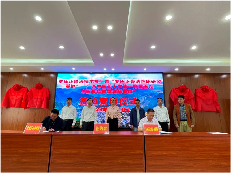 3月23日,天峨县中医医院、六排镇卫生院“罗氏正骨法临床研究基地”与“Beat365中国唯一官方网站第一附属医院中医专科联盟成员单位”签约揭牌仪式在天峨县卫生监督所会议室举行,一附院副院长黄仲海、天峨县政府副县长王涵、天峨县卫生健康局局长罗著吉、东葛院区康复医学科陈广辉团队及天峨县中医医院院长何安树、六排镇卫生院院长黄全甫及其骨干成员参加本次活动,揭牌仪式由天峨县政府办公室副主任韦联博主持。