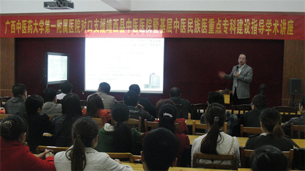 在经过了几个小时的驱车之后,一附院专家组一行于24日傍晚18时许来到了靖西县中医院,受到该院全体领导班子的热烈欢迎。随后一附院黄贵华院长、桂雄斌副院长在靖西县刘鉴副县长、靖西县卫生局吴世献局长、靖西县中医医院李鸿翔院长、张祖堂副院长、吕姜副院长等人的陪同下,参观了靖西县中医医院新院区,并对中医医院的建设发展提出了良好的建设性意见。当天晚上,一附院院长黄贵华教授和大内科主任史伟教授不顾路途劳累,相继为该院100多名中层干部及医务人员作了题为《六经辨证临床应用》、《药物相关性肾损害》的专题学术讲座。学术讲座中,黄院长就临床如何应用中医经方进行了系统讲解,理论阐述深入浅出,结合具体病例运用的评析通俗易懂;其后史伟教授则围绕临床常用药物对肾脏损害进行多例证详尽分析,使到会的医务人员受益匪浅。现场医务人员反响强烈,纷纷表示讲座内容贴近临床,实用,并感慨“很久没有听到那么精彩的讲课了”。