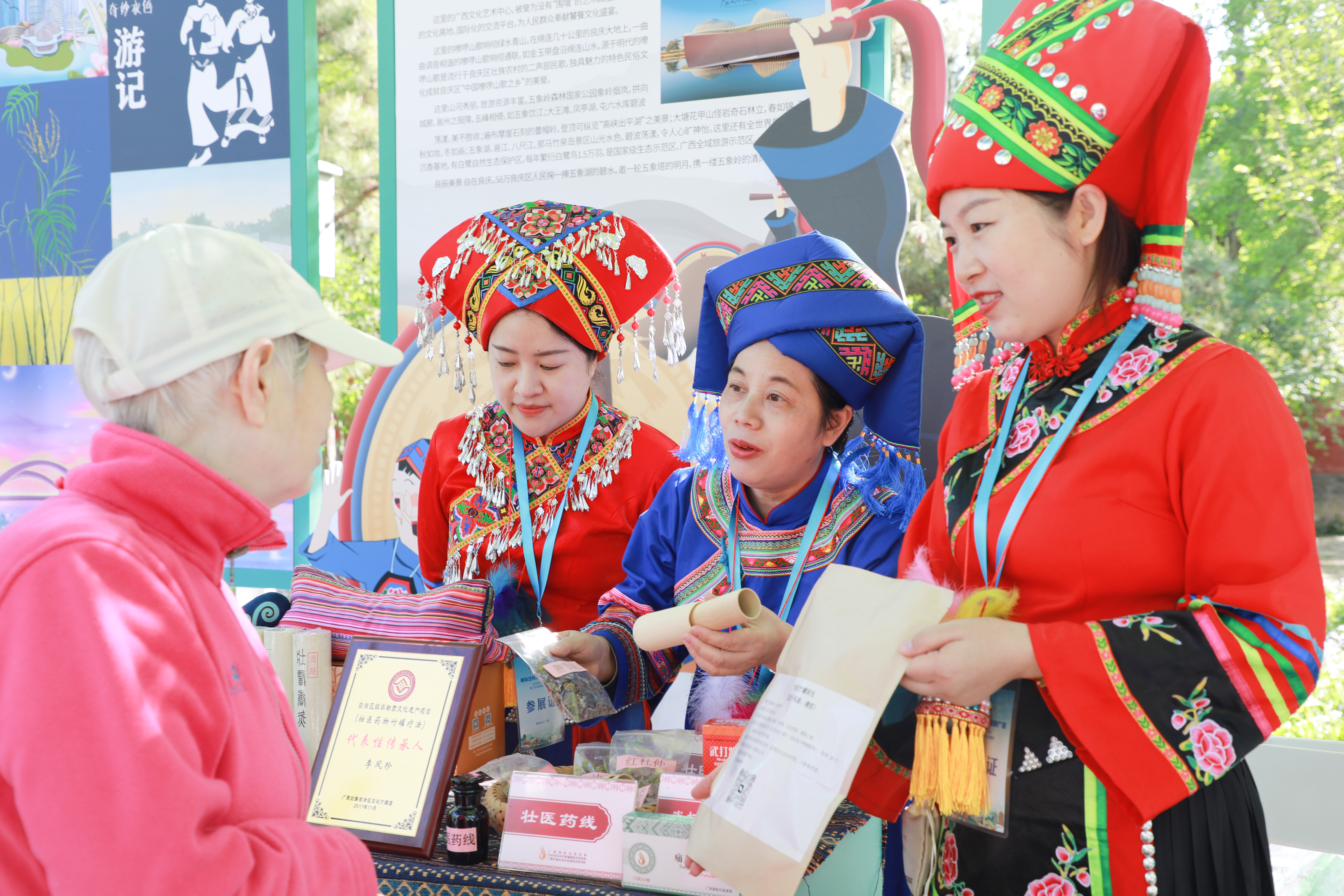 4月16日,“潮玩三月三 相约游广西”(北京)宣传推广活动暨广西非遗精品艺术展演在北京市地坛公园举办。附属国际壮医医院受邀参加,现场展示自治区非物质文化遗产项目壮医药物竹罐疗法和医院研发的壮医药大健康产品,广受北京市民朋友的喜爱。