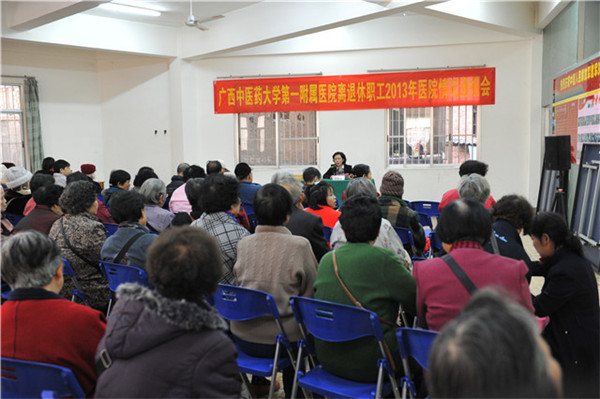 2014年1月22日下午,一附院离退休职工2013年医院情况通报会在一生活区离退休老同志活动室举行。一附院党委书记李敏智作2013年医院情况通报,300余位离退休职工和工会离退科工作人员参加了会议。会议由一附院工会主席王粤湘主持。