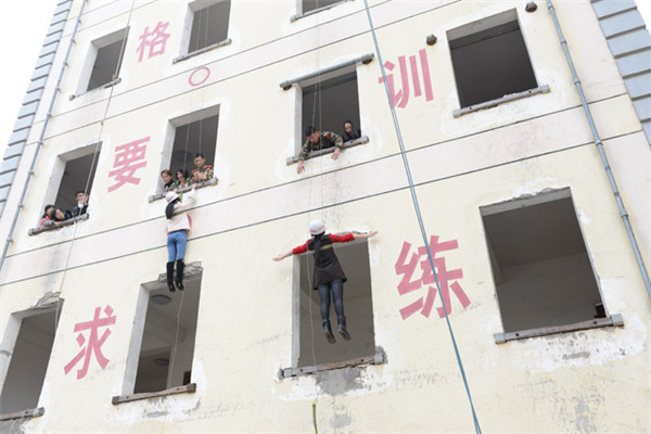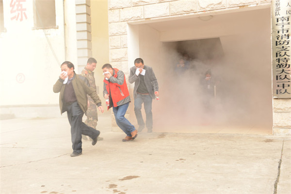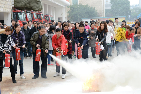 培训结束后,全体参训人员乘车到南宁市消防支队进行消防实战演练。整个演练分火场疏散、灭火器和消火栓的使用、高楼绳降等科目。在现场工作人员指挥下,疏散人群有条不紊的进行紧急疏散,整个过程紧张、有序、安全、快速,不足三分钟时间内,参训职工全部疏散至室外安全地带。疏散演练完毕后,消防队员进行灭火器、消火栓等灭火演示。职工们踊跃参加了灭火器实际操作和绳降体验。