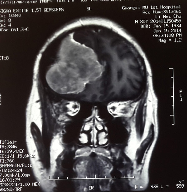 经过确诊,李大爷的病是由右侧额区凸面脑膜瘤引起的。正是这个肿瘤压迫了神经才造成老人左肢无力。但鉴于他年事已高,医生认为手术风险极大,家属在医生推荐下来到瑞康医院神经外科求救。