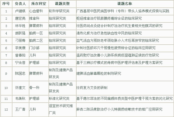 一附院获2014年广西中医药民族医药传承创新专项立项课题12项 来源:一附院 作者:林华胜 日期:2014-04-17 点击数: 次 分享到: 根据广西壮族自治区卫生厅桂卫中﹝2014﹞6号文件,一附院获2014年广西中医药民族医药传承创新专项立项课题12项。其中软科学研究类1项、临床研究类7项、制剂及健康产品研发类2项、标准化研究类1项、适宜技术研究推广类1项。 附:一附院2014年广西中医药民族医药传承创新专项立项课题名单: 打印正文 关闭本页