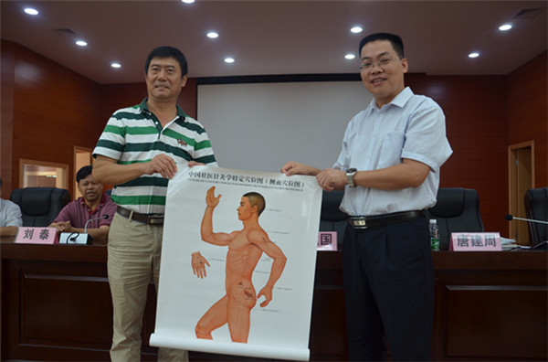 26日下午,外联拓展部林强副主任带领纪云西博士后和推拿科的甘炜医师赶到罗城仫佬族自治县中医院,进行基层重点专科帮扶对接。纪云西博士后在当晚为该院100余名医务工作者进行了主题为《科研项目的选题和申报》的专题报告。27日上午,纪云西博士后和甘炜医师分别对该院的重点专科脾胃病科和针推科进行了重点专科指导查房,对疑难病人进行诊断,并为基层医师对病人的下一步治疗提出具体、可行的建议。工会王粤湘主席和纪云西博士后共同向罗城仫佬族自治县中医院捐赠壮医针灸图本及壮医针灸穴位图。