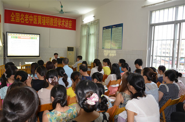 下午3时,在崇左市中医壮医医院小会议室,黄瑾明教授为该院50多名医务工作者进行了一场精彩纷呈的学术讲座。黄老教授从壮医针灸学历史渊源、壮医针灸学发展近况、壮医针灸学的理论基础、壮医针灸学的腧穴、壮医脐环穴及其临床应用、壮医针灸学三大疗法技术操作规范等六个方面向在场的医务工作者生动的讲解了壮医针灸学的基本情况,并通过列举具体的病例,着重向基层医务人员讲解了壮医脐环穴在临床上的应用。黄老教授深入浅出的讲解,让在场所有的医务人员都受益匪浅,黄老教授为基层培养热爱壮瑶医药专业人才,促进壮瑶医药事业的发展,发挥了全国名老中医的模范带头作用。