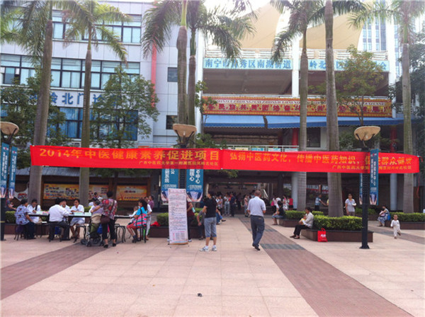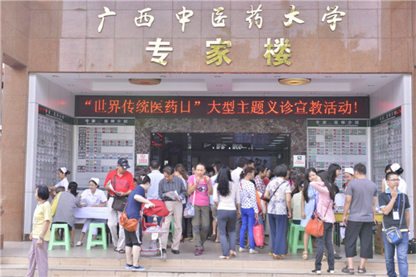 在一附院本部大堂,壮医科全国名老中医黄瑾明主任医师,烧伤疮疡周围血管外科张力主任医师,肝病科胡振斌主任医师,心血管科王庆高博士,皮肤科吴志洪博士以及脑病、儿科、脾胃、肾病、肿瘤、肺病、治未病、营养科等15名专家早上8时准时来到义诊现场。前来就诊的患者络绎不绝,全国名老中医黄瑾明主任医师诊台前围满了前来求诊的患者,黄老医术精湛,对待患者热情又不失严谨,患者就诊后均满意而归。其他参与义诊的专家也认真细致的为来诊病人进行诊治、指导饮食和合理用药,并认真解答群众关于中医药保健养生的问题。义诊现场还进行了免费体质辨识分析测评,测量血压,健康宣传资料发放。