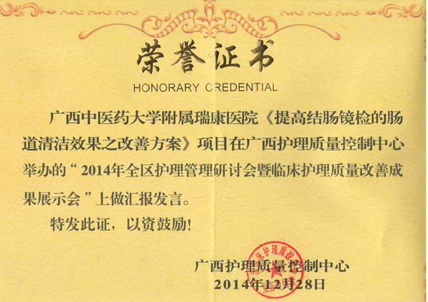 2014年12月27日至28日,由广西临床护理质量控制中心举办的“2014年全区护理管理研讨会暨临床护理质量改善成果展示会”在南宁市凤凰宾馆召开。全区共有58项护理质量成果参与本次展示会,遴选出的16项成果单位在会上作汇报发言,另42项成果以海报形式展示。瑞康医院开展了近三年的护理品管圈活动,在此基础上有两个项目脱颖而出,护理部在大会上做了汇报发言和海报展示——《提高结肠镜检的肠道清洁效果之改善方案》和《降低经外周静脉输注多巴胺致静脉炎的发生率之改善专案》,受到与会专家组和全区护理同行们的一致好评。