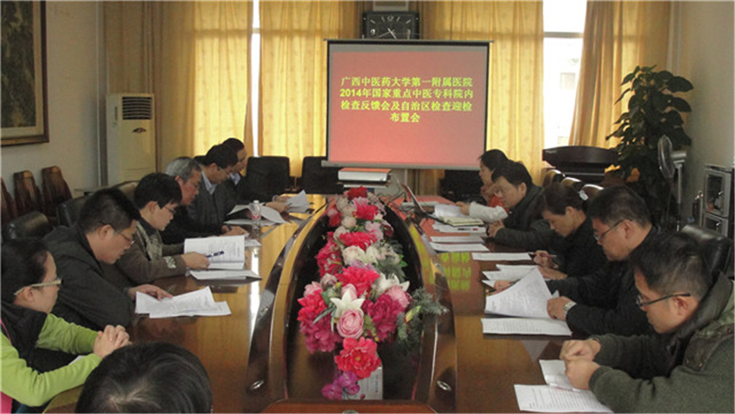 一附院高度重视国家中医药管理局重点专科中期评估工作,根据国家中医药管理局及自治区中医药管理有关局文件精神,围绕工作重点多次召开专题布置会,并于2015年1月6日组织院内专家进行了院内评估检查工作,1月8日桂 雄斌副院长主持召开了院内评估检查反馈会及自治区级检查迎检布置会,会议上,医务部对院内评估检查中发现的问题进行了反馈并提出整改意见。桂副院长在会上 再次强调各重点专科应认真组织本专科做好整改工作,要精心组织整改落实,严格审核重点专科上报资料及数据信息,务求数据真实可靠,切实做好迎检工作。
