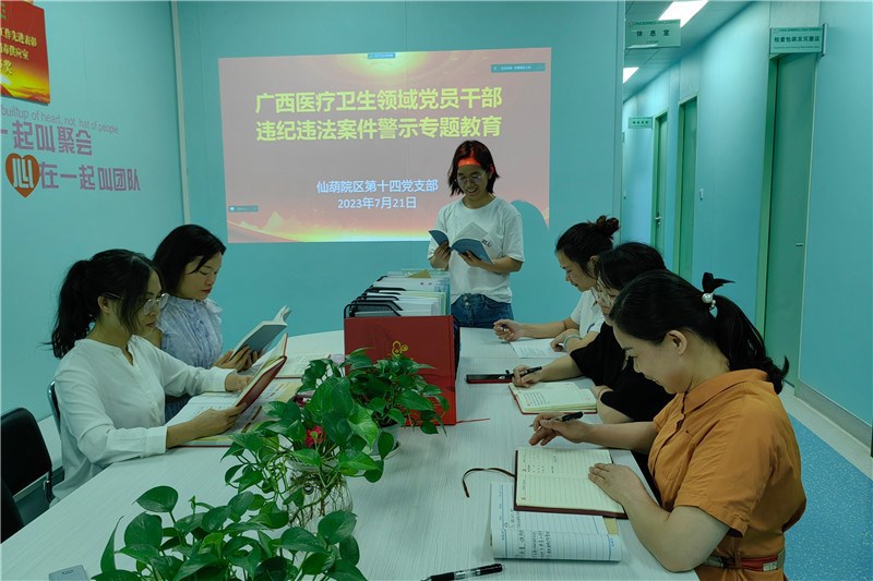 为全面推动廉洁文化建设,践行廉洁行医价值观,弘扬健康向上的医德医风,促使崇廉、守廉和倡廉的廉洁文化深入人心,7月21日中午,一附院仙葫院区党总支第十四党支部开展深入学习广西医疗卫生领域党员干部违纪违法案件警示专题活动。