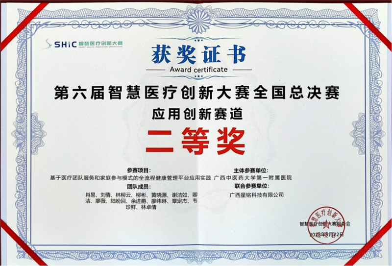 本次总决赛由来自全国224支参赛队伍就技术创新、应用创新、医疗信创、基层创新4大赛道进行激烈角逐。赛场上高手云集、竞争激烈,竞赛项目技术“含金量”高,项目内容精彩纷呈。一附院项目于8月26日获得广西赛区第一名后代表广西参加全国总决赛,并在总决赛8分钟讲解中从项目背景、项目方案、创新优势、运营情况及推广意义等方面进行介绍,着重强调了中医4P理论(预测、预防、个体化、个体化参与)以及家庭参与模式在平台中的创新应用,获得了评委的一致认可,最终荣获大赛二等奖。