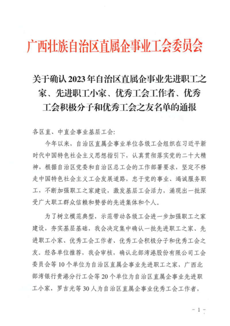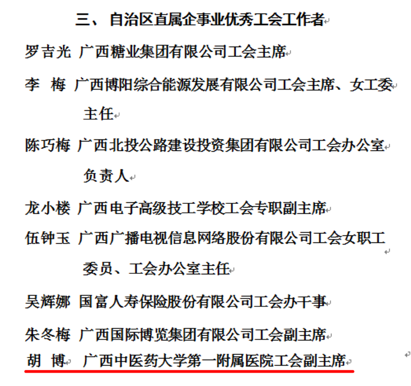 近日,广西壮族自治区直属企事业工会委员会发布《关于确认2023年自治区直属企事业先进职工之家、先进职工小家、优秀工会工作者、优秀工会积极分子和优秀工会之友名单的通报》,《通报》对30个单位、39名个人予以通报表扬。一附院胡博同志荣获 “2023年自治区直属企事业优秀工会工作者”称号。