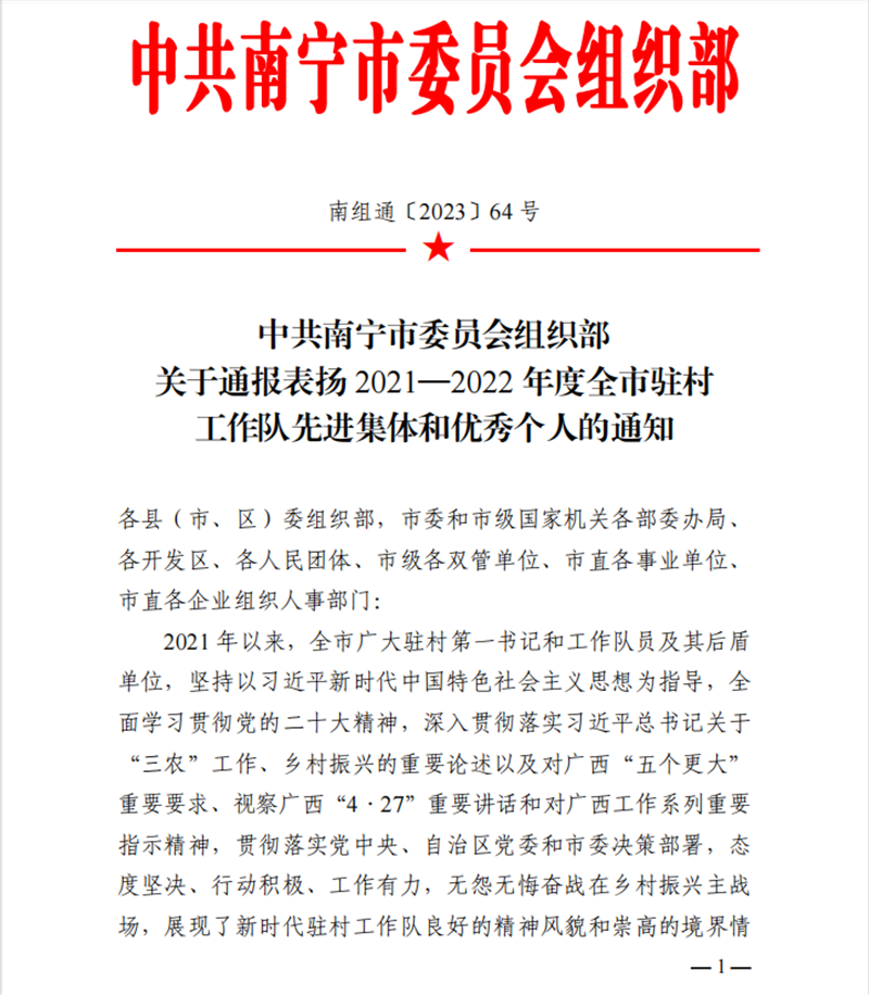 近日,中共南宁市委员会组织部下发了《关于通报表扬 2021-2022 年度全市驻村工作队先进集体和优秀个人的通知》,通报表扬94个先进后盾单位、100名优秀驻村第一书记、200名优秀驻村工作队员。一附院荣获南宁市2021—2022 年度驻村工作队先进后盾单位称号。