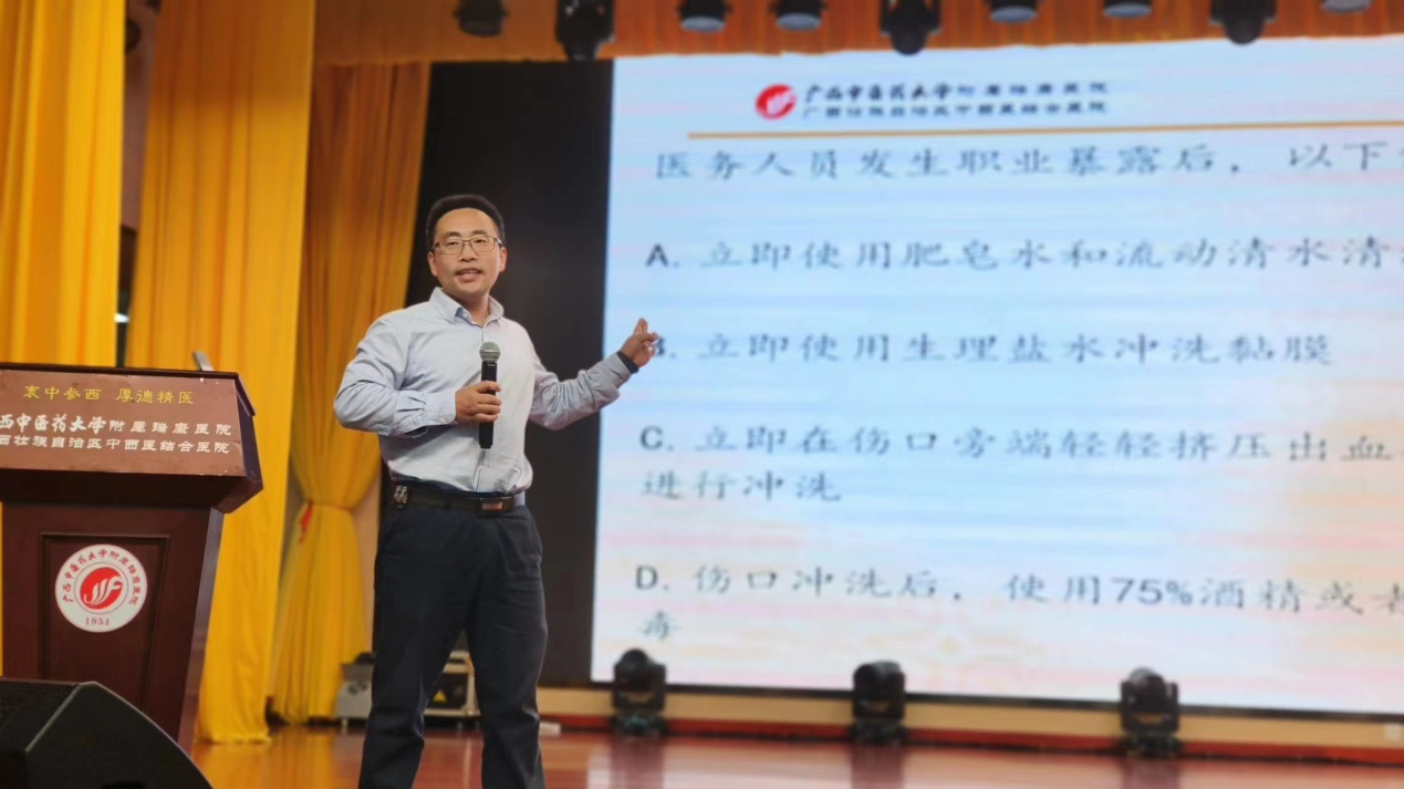 同学们既是艾滋病防治宣传的重点人群,同时作为医务工作者,也是抗击艾滋病战线上的主力军、生力军。11月30日,艾滋病研究中心办公室联合教务科在医院10楼学术报告厅共同举办了一场“防艾”健康大讲堂。艾滋病研究中心办公室副主任刘振威主持大讲堂并做总结。黄婷主治医师做了艾滋病预防基本知识及艾滋病职业暴露的评估与处理的讲座。培训后的有奖问答环节,同学们都积极参加,起到了良好的宣教作用。