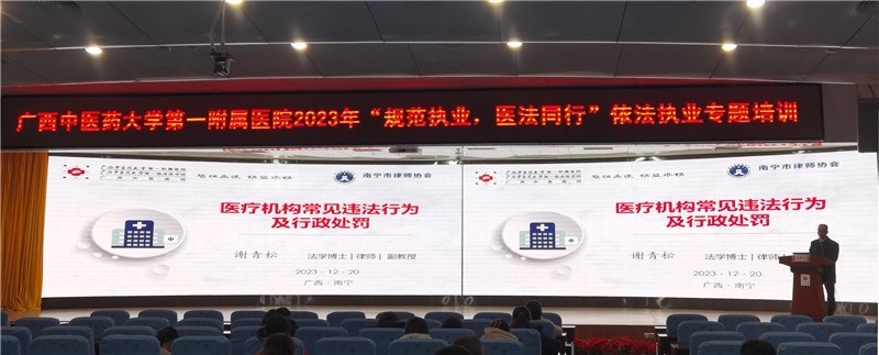 本次培训由南宁市律师协会医疗卫生专业委员会成员谢青松副教授带队,广东申宝(南宁)律师事务所主任邓宝能律师、广西万益律师事务所综合业务部副部长郭建强律师共同开展专题培训。三位专家从理论与实务角度出发,以具体案例警示深入浅出地为医务人员深刻讲解,全面清晰地告知医务人员应当遵守好、敬畏好法律。